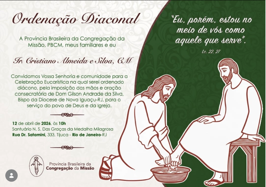 A Província Brasileira da Congregação da Missão (PBCM) celebrará, no próximo dia 12 de abril de 2026, a ordenação diaconal do seminarista Ir. Cristiano Almeida e Silva, CM. A celebração acontecerá às 10h, no Santuário Nossa Senhora das Graças da Medalha Milagrosa, na cidade do Rio de Janeiro.